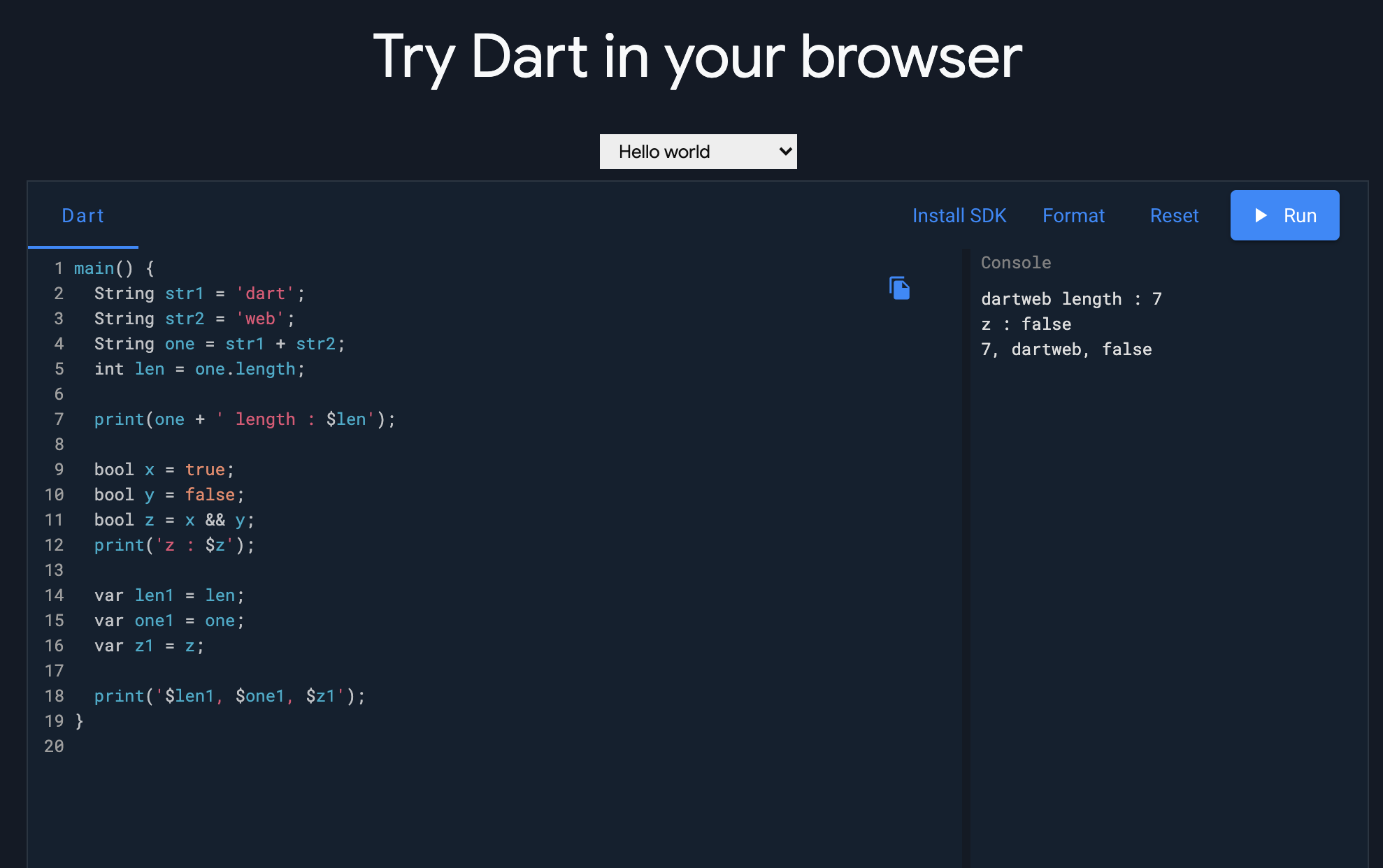 다트 언어를 컴파일하기 위한 환경을 만드시지 못한 분들은 위 링크를 타고 들어가셔서, 다트를 설치해주시면 되겠습니다^^ 귀찮으시면 그냥 위 포스트 맨 아래에 있는 링크를 타고 들어가 테스트 해보시면 되겠습니다.