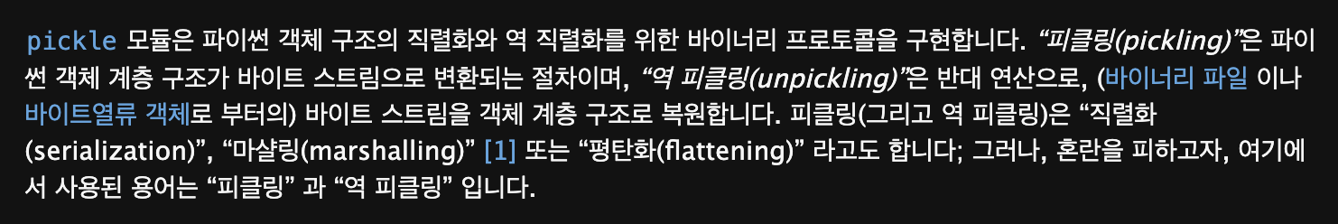 - pickle 을 사용해서 데이터를 바이트 스트림으로 직렬화 하여 파이썬에서 데이터를 여유롭게 다뤄봅시다.