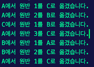 1. A,B,C라는 봉이 세개 있습니다. 각 봉은 시작, 중간, 끝이라 두고 시작점에 있는 원반들을 끝의 지점으로 옮기는것이 목표입니다.