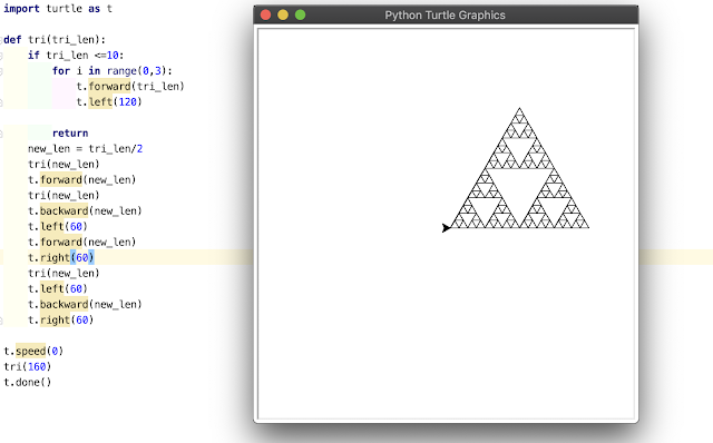 예전에 간단하게 만들었던 시에르픈스키 삼각형 그리기 코드입니다. 함수내에 선언된 자기 자신을 계속해서 호출해주며 프로그래머가 원했던 값을 출력하는 것이라고 생각하면 편합니다.
